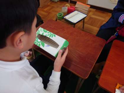 ティッシュペーパーの空き箱に輪ゴムを巻いて弦にします。