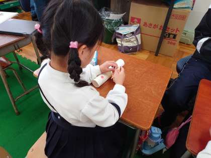 そして、トイレットペーパーの芯のネックを差し込んで、ストラップをつけたら完成です。