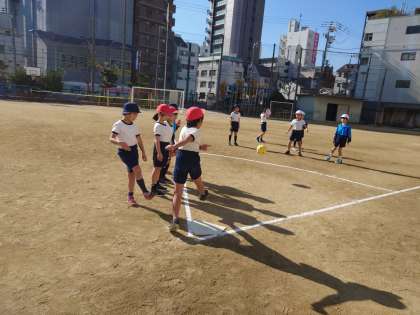 【1組】ならびっこキックベースで、これまで作ってきたルールを使ってトーナメント大会をしました。