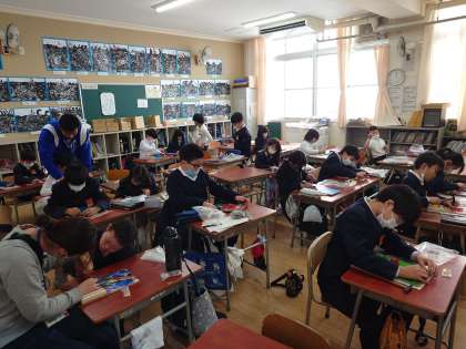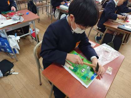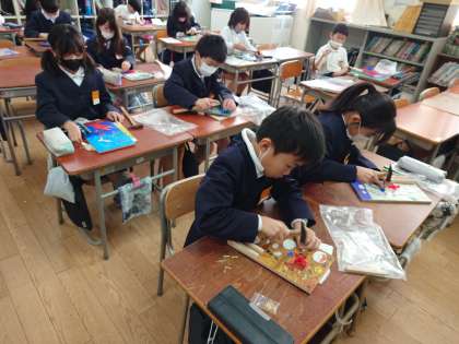 【1組】コリントゲームの盤の絵ができた人から、釘打ちを始めました。