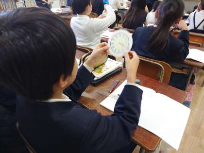 両面に印刷された時計の針がさす時刻の関係を調べます。