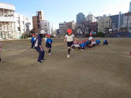 今日は、1人で跳ぶ短なわとびをして、長なわとびの跳び抜けに挑戦です。