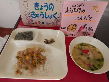 ぞう煮は関西風の白みそ仕立てでお餅がトロトロ、ごまめはパリパリです。