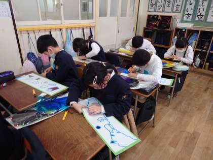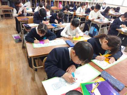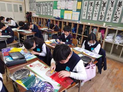 【1組】図画工作科で、ステンドグラスのような色とりどりの窓がついた箱を作ります。