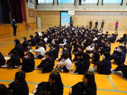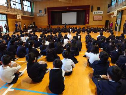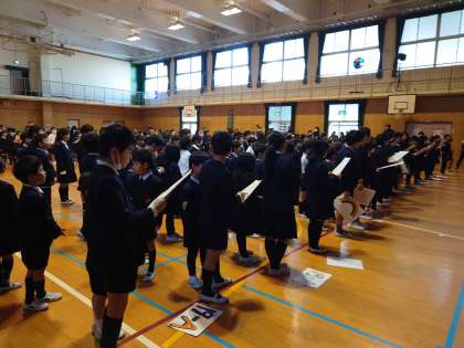 今朝の児童集会は、月末に開かれる「卒業を祝う会」の練習です。