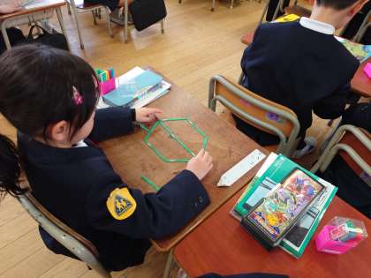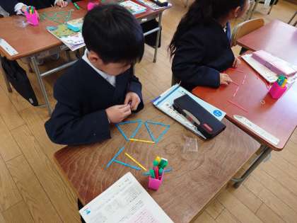 【1組】算数科の学習で、数え棒を使って形づくりをしました。