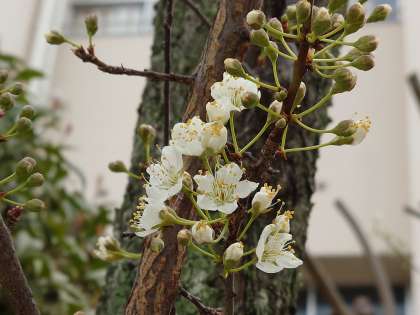 校庭の梅の花が散り、桜の開花が待たれますが、その間をつなぐようにプラムの可愛い花がたくさん咲いています。