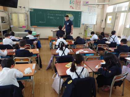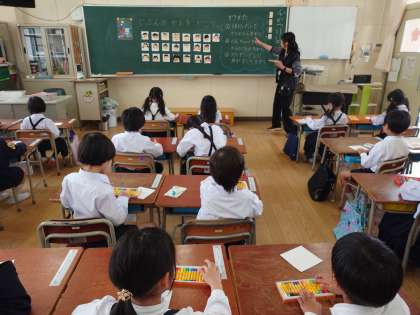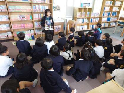 初めての図書室で、司書の先生から図書室の使い方を教わりました。