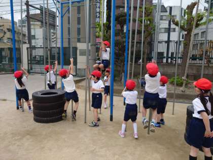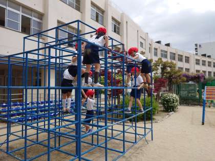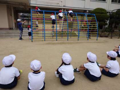 初めて使う遊具は、安全な使い方を習ってから登りました。