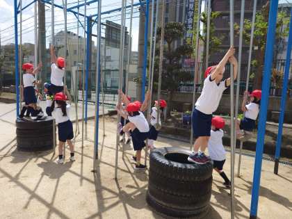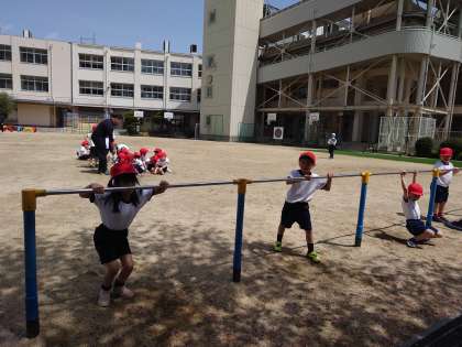 今日は3組が体育の時間に固定遊具を使って遊びました。