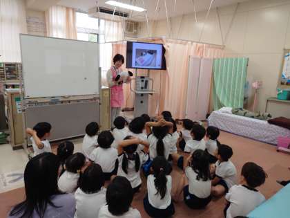 最初に、保健室の先生から、保健室の使い方についてクイズを交えて教えてもらいました。