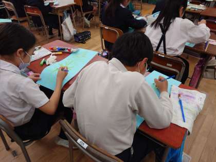 鮮やかな花の黄色に対して、穏やかな茎の黄緑色をどのように出すのか、絵具の混ぜ具合を考えながら、ていねいに塗っていました。