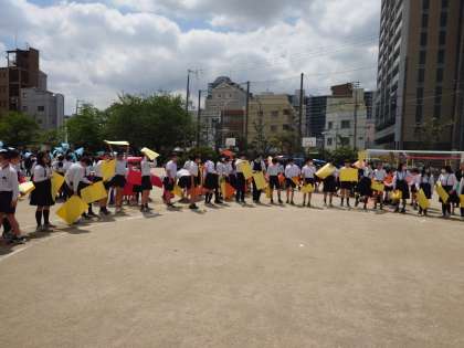 最後に、運動場で人文字を作って航空写真を撮りました。