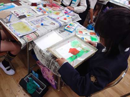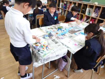 図画工作科で、絵具を使って色遊びをしました。
