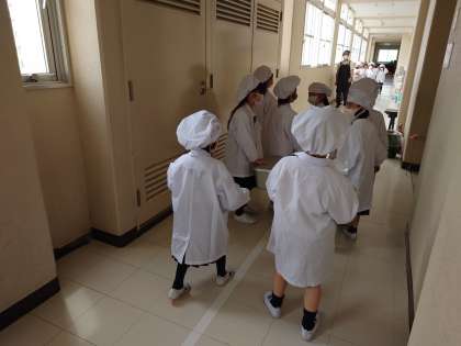 これまで1年生は、少し早めに給食準備を始めていましたが、今日から他の学年と同じで4時間授業をしてからの給食準備です。