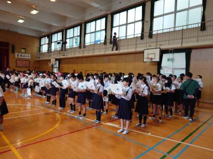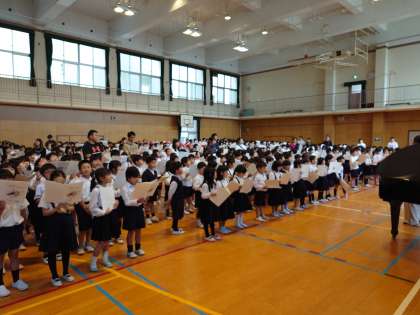 今日は校歌や大阪市歌を歌ったあとに、トトロの「さんぽ」を歌いました。
