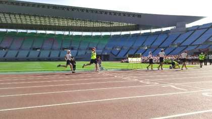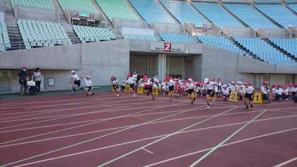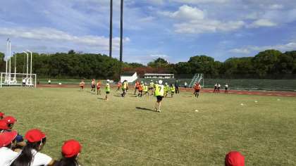 当日は、天候にもい恵まれ、プロのスポーツ選手も使用する会場で、心も体も弾みながら、他校の子どもと競技しながら交流することができました。