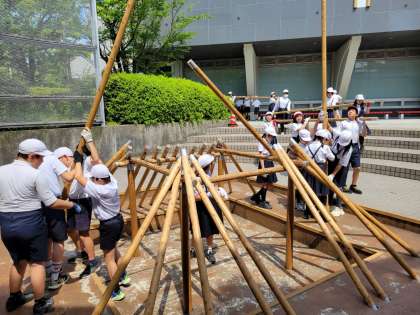 最初に、竪穴式住居をみんなで協力して建てました。