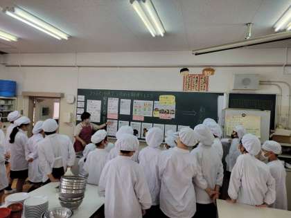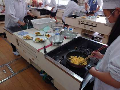家庭科の学習で、フライパンを使った調理実習をしました。