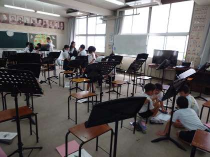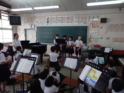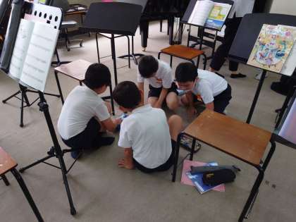 リズムや重なり、声の大きさなどを工夫して、グループで作りました。