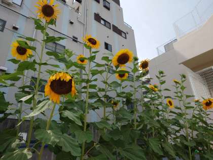学校では、学習園のひまわりが、太陽のように大きな花をたくさん咲かせています。