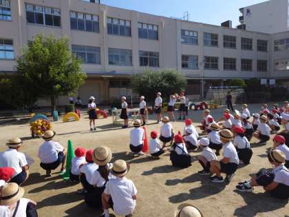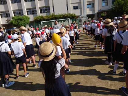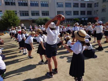 今日は運動場で、たて割り班対抗のボール送りゲームをしました。