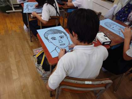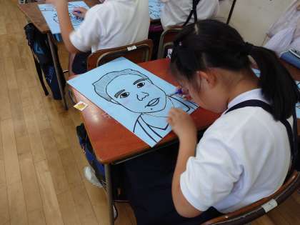 図画工作科の版画づくりで、下描きをした版木を彫刻刀で彫っていきます。