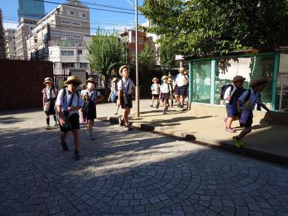 子どもたちは日差しを浴びて、汗をかきながらの登校です。