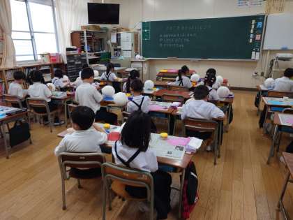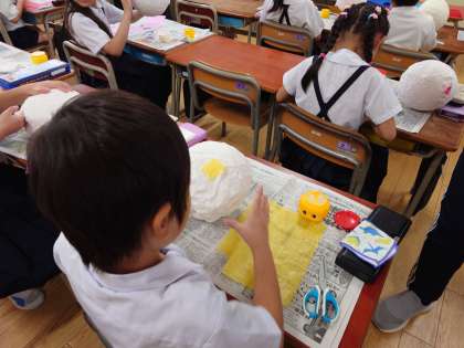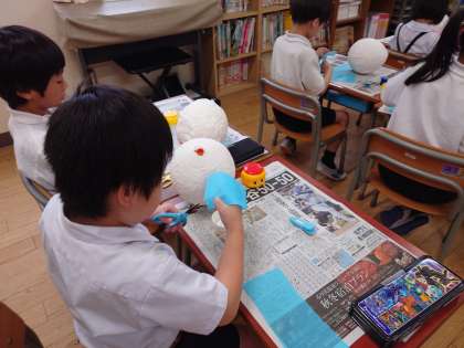 図画工作科の時間に作ったふうせんたまふごに色和紙を貼り付けてカラフルにしていきます。