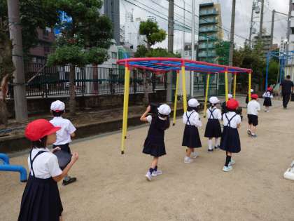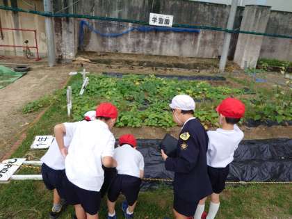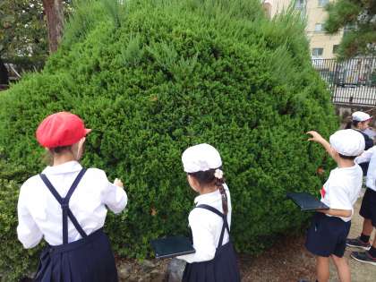 そこで、学校の中の生き物や草花を見つけに行きました。