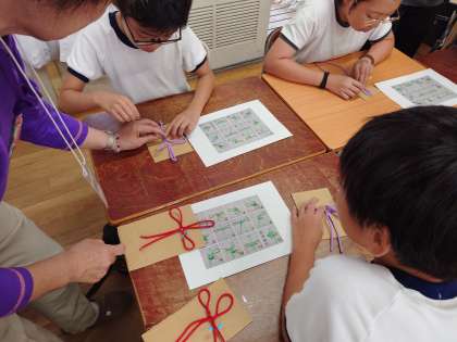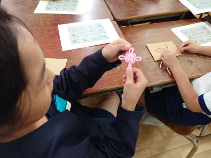 後半は、中国結びと呼ばれるひも結びに挑戦しました。