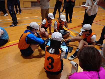 作戦を生かしたゲームができるように、チームで話し合いながら取り組みました。