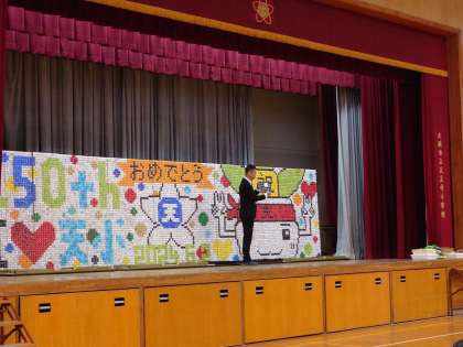 今日の児童集会は、児童会主催のペットボトルキャップアートの完成披露会をしました。