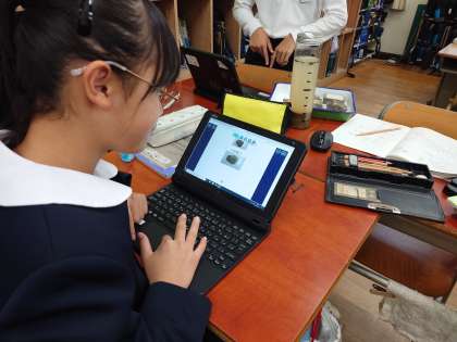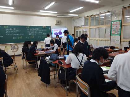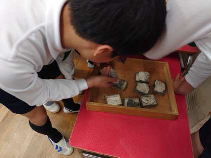 石の標本を見ながら、粒の大きさや積み重なり方を考えて、砂岩や泥岩などの種類を班別していきます。