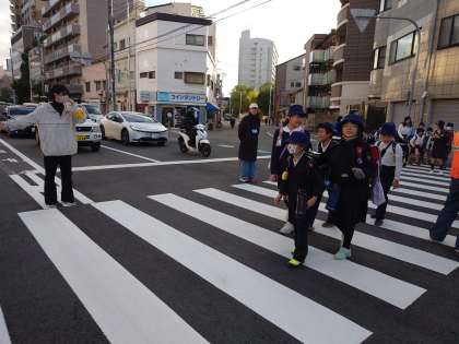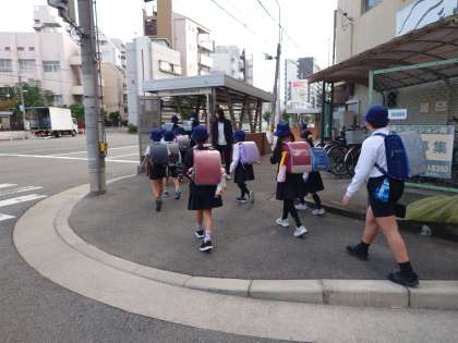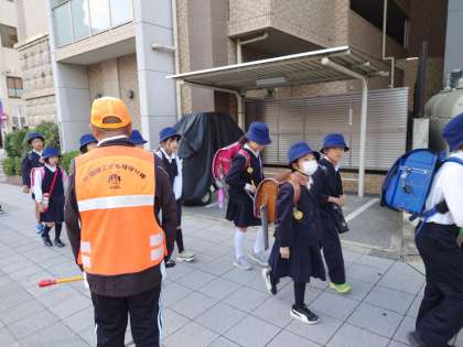 地域の見守り隊の方やたくさんのPTAの皆さんに見守られての登校です。