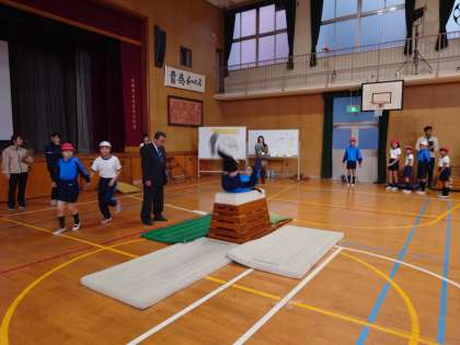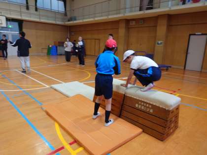 跳び箱の上で前回りをする台上前転などの技に挑戦しました。