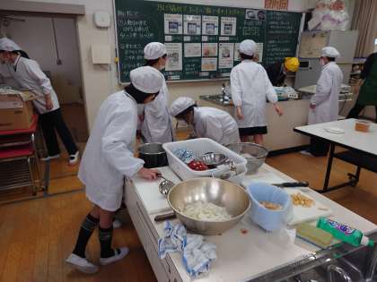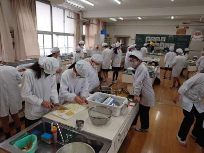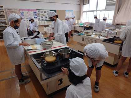 家庭科の調理実習で、ごはんとみそ汁を作りました。