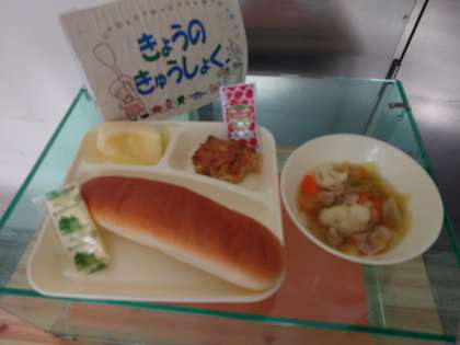 とうふローフは、普通ミートローフに豆腐を加えるのですが、給食ではツナを使って、よりヘルシーにしています。
