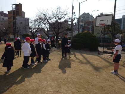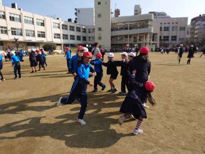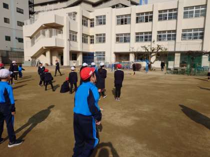 日差したっぷりの運動場では、なわとびや、だるまさんが転んだや、子とり鬼などで楽しく遊びました。