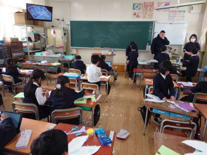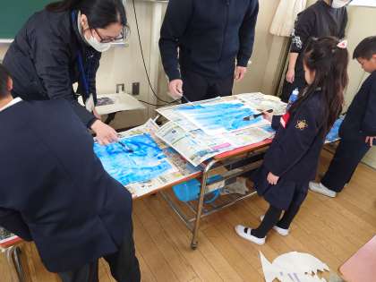 スイミーの版画には海の背景が必要なので、版画を刷る和紙に海の模様を描きました。