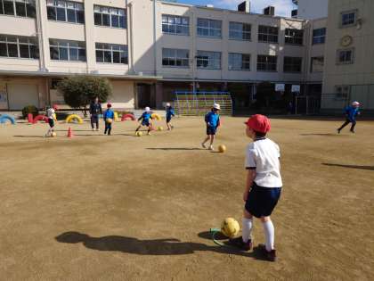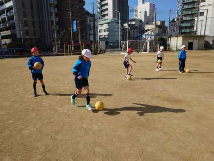 みんな、ボールの速さに体がついていけるように調節しながら、上手にけっていました。