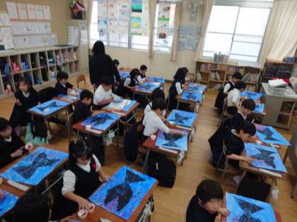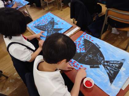 今日は刷り上がった版画に、スイミーの仲間を描き加えていきました。