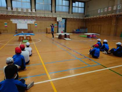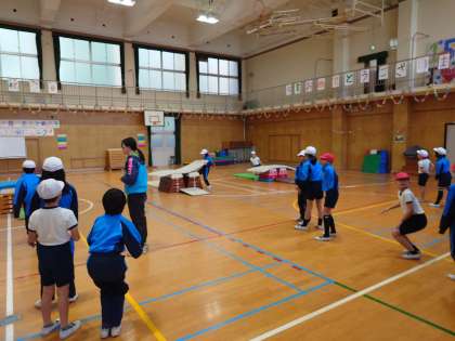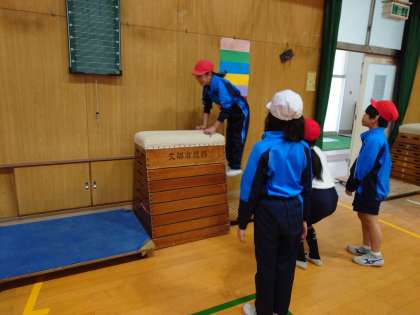 体育科の跳び箱運動で、台上前転に取り組みました。