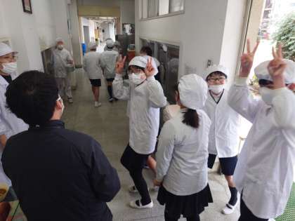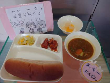 さらに、今日のカレースープのラッキーにんじんは、給食調理員さんからのお祝いで、今まで出てきた全種類が入っています。