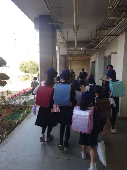 登校班で一緒に来た6年生が1年生を教室や下駄箱の所まで送ってくれていました。