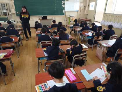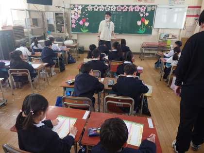 先生から持ち方や書き方を教えてもらって、線かきや色塗りをしたり、自分の名前を書いたりしました。
