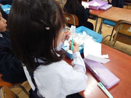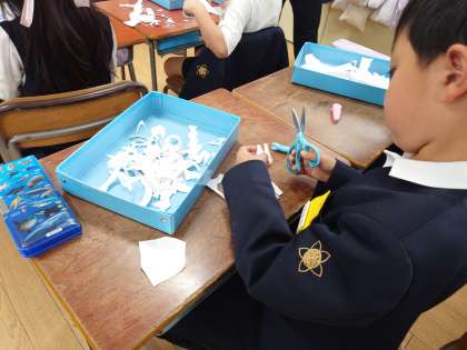 切った部品を色画用紙に貼って、どんなアートができるのか楽しみです。