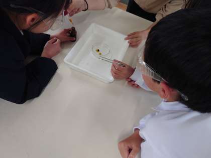 発芽前と発芽後の種子に、ヨウ素液を垂らすとあら不思議、はっきり違いが分かるくらいの色の変化がありました。