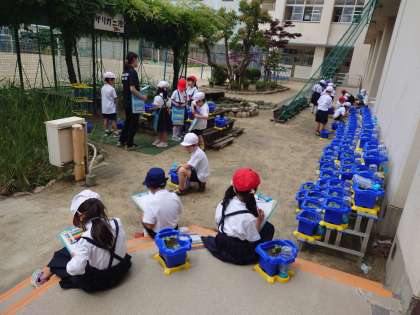 アサガオの種をまいて一週間、芽が出てふたばが広がりました。