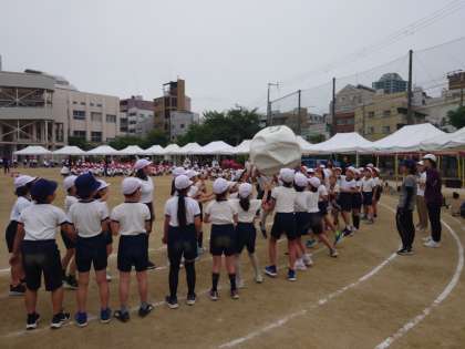 大玉送りは、1回戦赤の勝ち、2回戦は白の勝ちで引き分けました。
